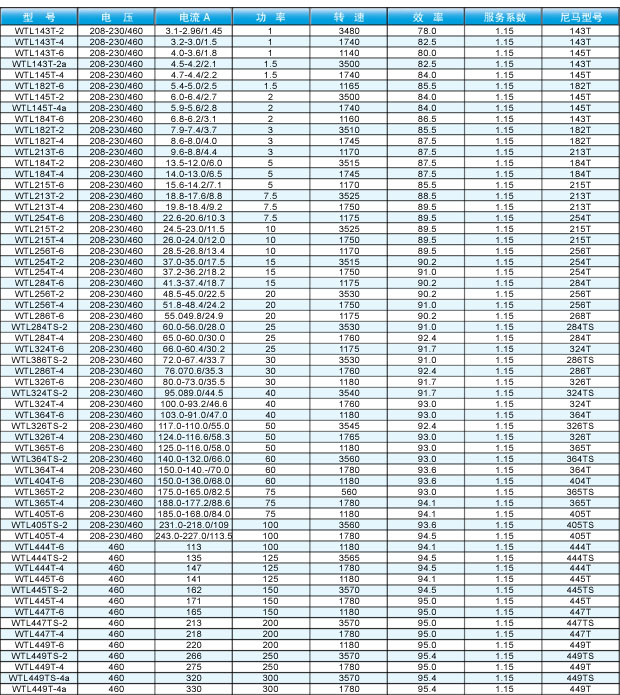 該系列電機為全封閉自扇冷式三相異步電動機,符合美國電氣制造商協會Nema的相關標準,電機采用F級絕緣,尼馬B設計或C設計,功率范圍從1馬力到300馬力,涵蓋2、4、6、8極,產品已獲得美國及加拿大政府的相關能效認證,證書號CC0082A及EEV2234888,亦獲得UL及CSA安全認證。